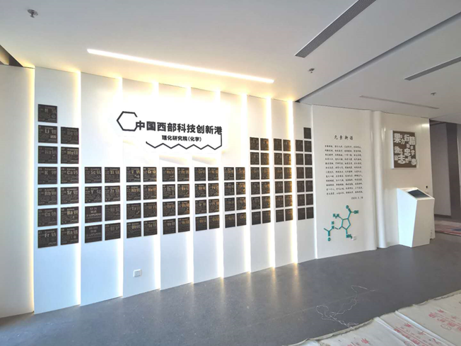 在彰显学科内涵的化学元素设计方面,学院在logo设计、墙面设计、内饰场景等元素的设计上充分融入化学元素及风格,体现出化学学科的内涵精神与特质。例如,学院在研究院一层东左墙面设置教师冠名元素周期表,为主动捐赠学院建设的教师、有突出贡献的退休教职工、优秀校友等设计制作带有人员姓名的专属化学元素文化砖,并可通过相应配置的查询系统展现化学元素中英文名称、电子结构、化学性质、常见用途、人员姓名、研究方向和联系方式等信息,集纪念性、展示性与实用性于一身,凸显“化学+”文化墙特色。此外,为保留具有历史意义的设备等实物,特别是第一代西迁教授艰苦创业的一些实物,学院结合学科特色建成了“化学西迁陈列室”,通过一件件承载着厚重交大西迁历史的文物,激励学院师生“不忘初心、牢记使命”的坚定理想信念,将以爱国主义为核心的西迁文化根植于每位交大人的心田。