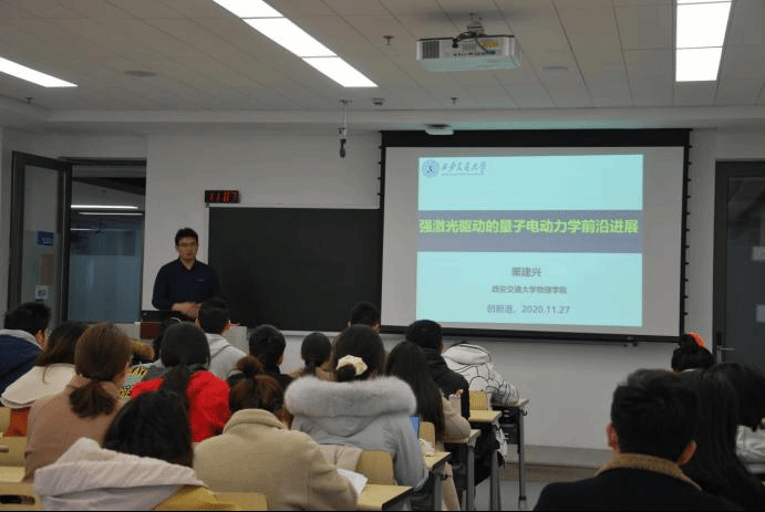 在最后科研培训环节,物理学院栗建兴教授介绍了强激光驱动的量子电动力学效应前沿进展,栗老师结合自己科研工作经历向同学们传授经验和感悟。栗建兴老师给同学们强调,做科研要沉下心、苦心钻研,做出创新性和实用性,也要注重团队协作和沟通交流,才能切合时代需求和取得科技攻关成果。
