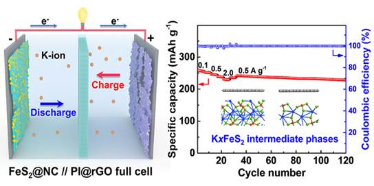 高国新副教授、丁书江教授与剑桥大学石墨烯中心郗凯博士合作,采用一种新颖的“吹泡泡”法制备出氮掺杂碳包覆的铁基硫属族化合物二维纳米复合材料(FeS2@NC),表现出优异的钾离子电池性能和应用前景。在0.1 A/g电流密度下进行钾离子半电池充放电测试,可逆比容量达到525.5 mAh/g;在10 A/g的高电流密度下的可逆比容量仍有154.7 mAh/g,循环寿命长达5000圈。与正极匹配后的钾离子全电池经120次循环后,容量保持率超过88%,库仑效率超过99.9%。密度泛函数(DFT)计算表明,硫化铁(FeS2)比硒化铁(FeSe2)表面更有利于钾离子的吸附和扩散,嵌钾中间相对钾离子吸附更强;氮掺杂碳包覆层进一步增强了电极材料和钾离子的相互作用。本工作提出的高性能电极材料设计思想和电化学反应机理研究为开发可实用化高性能电极提供了借鉴。