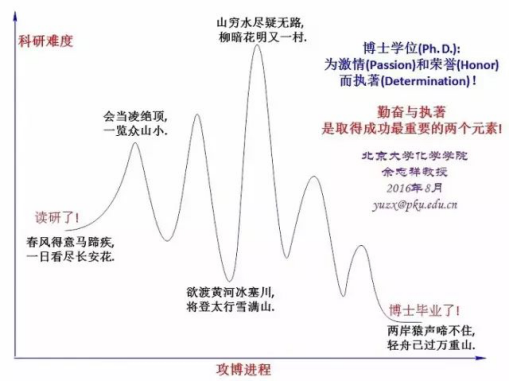 余志祥教授还在接近尾声时用了一张他原创的曲线图向我们展示了广大研究生在攻博进程中不同学习阶段的心理状态,并作出“勤奋与执著是取得成功最重要的两个元素”的总结。