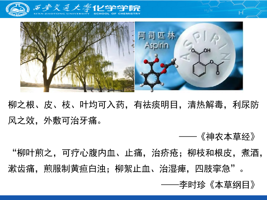 讲“柳树中走出的万能神药——阿司匹林的传奇故事”是“乙酰水杨酸的制备”课程思政的建设主线。