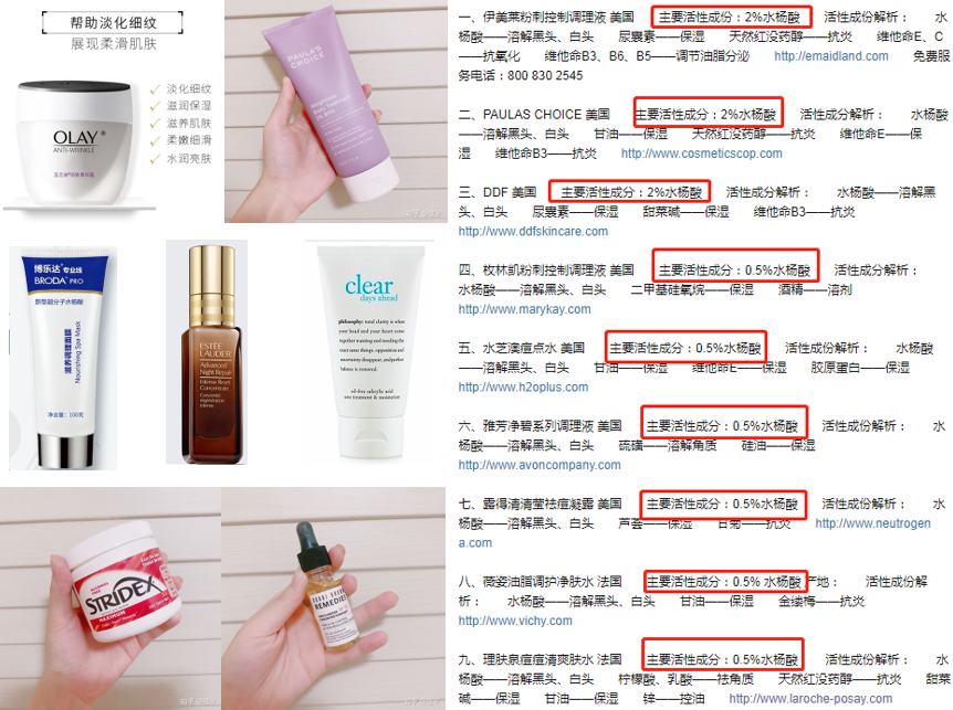 同理,作为阿司匹林制备原料之一的水杨酸具有一定的护肤效果,被广泛添加于国内外知名护肤产品中,是治疗痘痘、粉刺的护肤品和药物中的一种重要成分。然而,水杨酸是有毒性的,过高的浓度是不适合使用在脸上的,有一定的浓度限制。浓度在3%~6%的水杨酸可以用来去角质,高于6%则对皮肤有腐蚀性,40%高浓度的水杨酸具有强烈的角质腐蚀性质,可能引起皮肤发红过敏等症状。
