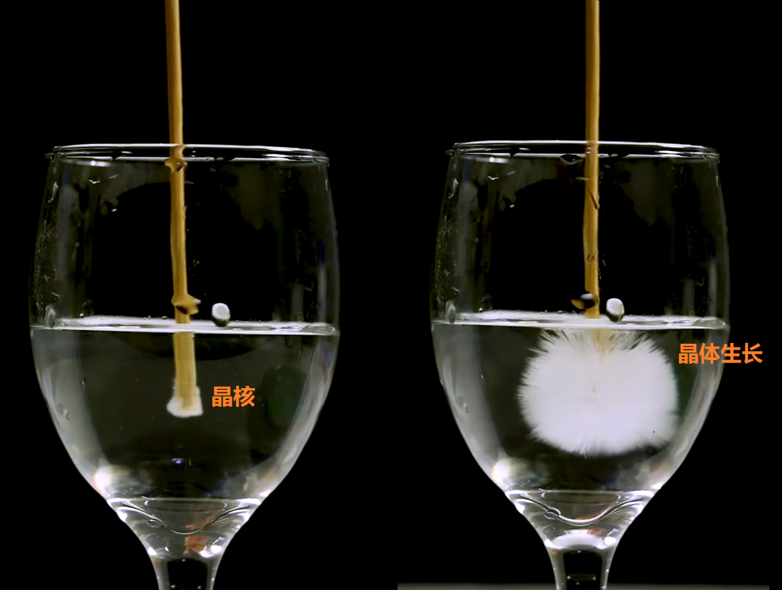 在讲述阿司匹林产品纯化时,重结晶的好坏决定产品的纯度及产率。在课程中引入《点水成冰》微视频,通过吸管类比玻璃棒,高脚杯类比烧杯、溶液类比实验体系,直观、生动地向学生展示介稳体系在受到搅动或加入溶质的“籽晶”时化学物质状态的变化,让学生深刻理解重结晶需要引入晶核、耐心等待晶体生长,在实操时通过玻璃棒摩擦烧杯壁促进晶核形成,并至少冰浴静置20分钟,以得到较好的晶体及产率。