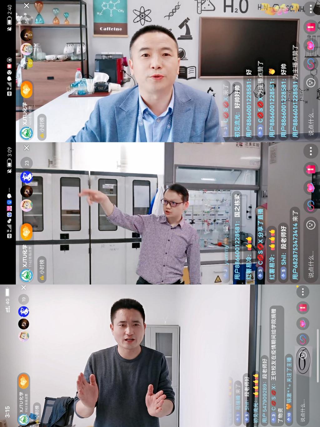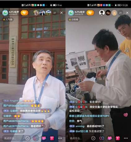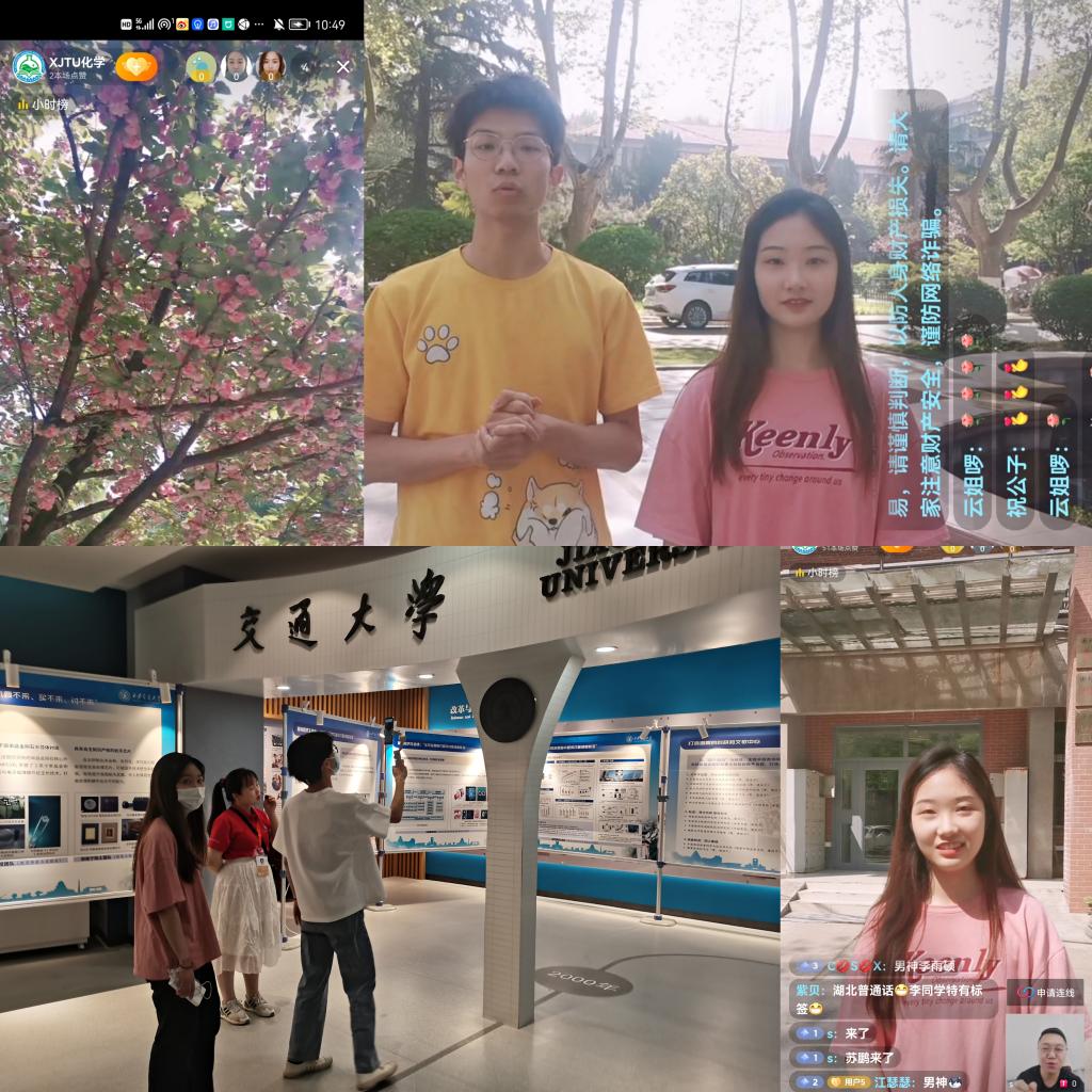 主持人李玉硕、费钰茜和摄像崔博带领大家回忆化学楼、樱花道、主楼教室、西迁纪念馆和康桥食堂,共忆青春校园。