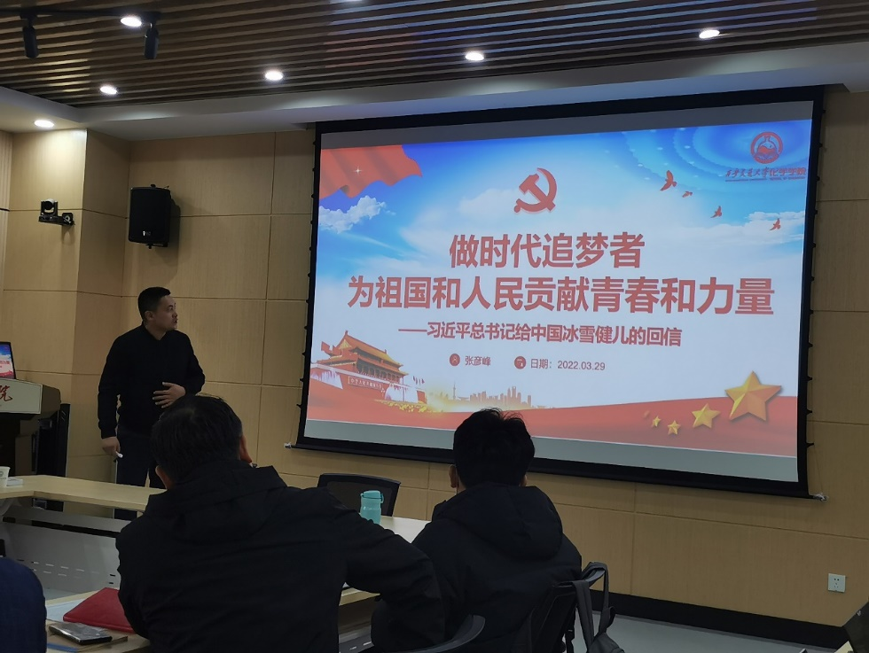 副院长、高分子师生联合党支部书记张彦峰同志领学“习近平总书记给中国冰雪健儿的重要回信精神”,介绍了社会各界包括运动健儿、高校师生等对回信精神的热议。张彦峰同志将习近平总书记的嘱托和科研工作结合起来,进行了系统的概述。他说,“必须积极主动学习新知识新思想,练就过硬本领。科研道路没有一马平川,创新之途不会鲜花满径,但我们不能因此而踟蹰不前,应该以更加开放的思路和积极的心态去迎接挑战。”“要坚持面向世界科技前沿、面向经济主战场、面向国家重大需求、面向人民生命健康,以医工应用为导向,与我校强势工科交叉融合,聚焦5G与人工智能、化学储能、流行病监测与防治领域的新化学材料、新化学合成方法、新化学反应机理。”
