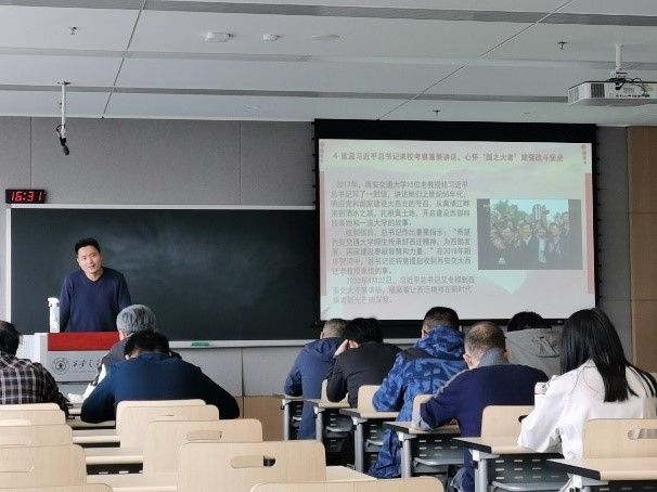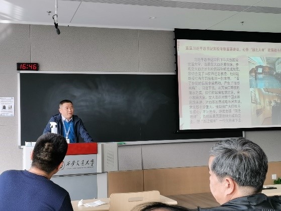 张彦峰书记通过讲党课的形式,带领大家重温了2020年4月习近平总书记考察我校时的重要讲话精神,并讲述了当时总书记来视察时自己的亲身经历。张书记记述到,当大家得知总书记来校视察的消息时十分激动,但仍按照疫情防护要求排队欢迎总书记的到来。当时习总书记在与西迁老教授座谈之后,遇到了在冷风中等待的师生们,总书记也十分的激动,便即兴进行了五分钟的讲话,总书记的讲话虽是即兴的,但是有思想、有角度、有深度、有格局,为我们的发展和科研提供了方向和动力。会想到一年前总书记的讲话,张彦峰书记又谈到了一年前化学学科作为第一梯队搬入创新港,作为交大“二次西迁”的主力军,我们更应以西迁精神为支持站好自己的岗。