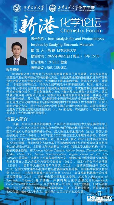 于2022年9月21日邀请日本东京大学副教授尚睿博士进行学术交流。本次报告题目为Iron-catalysis for, and Photocatalysis Inspired by Studying Electronic Materials(面向有机光电材料的新型铁催化反应和光电材料研究激发的新型光催化合成),报告主要介绍两种最近开发的铁催化转化技术,通过串联环化C-H/C-H聚合反应以获取π共轭分子,进而应用于有机发光及光伏材料等功能分子中。