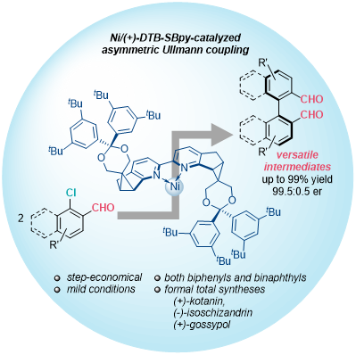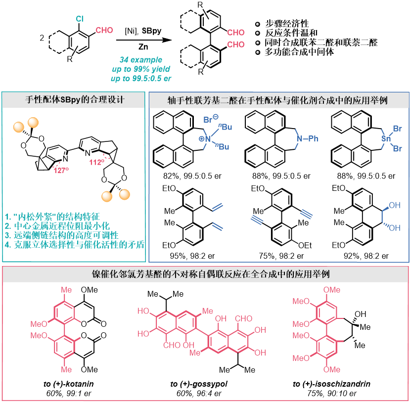 深度合作,通过富有挑战性的镍催化邻氯芳基醛的不对称还原自偶联反应再次展示了SBpy设计的合理性与有效性。以二(3,5-二叔丁基苯基)甲酮衍生的(+)-DTB-SBpy为配体,课题组高效、高选择性地合成了一系列光学纯的轴手性联苯二醛和联萘二醛化合物,反应催化活性高,条件温和。作者通过底物丰富的官能团转化展示了联芳基二醛作为重要合成中间体在具有手性联芳基骨架的催化剂与配体合成中的重要性。此外,作者也将该反应成功应用于具有生物活性的天然产物(+)-kotanin, (-)-isoschizandrin 和(+)-gossypol的形式合成中,进一步展示了反应的应用价值。该反应成功的关键在于独创性的手性2,2'-联吡啶配体SBpy的应用,既展示了SBpy配体设计的有效性,也为手性分子的选择性合成提供了新工具,为相关手性催化剂的设计提供了新思路。