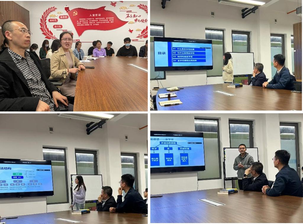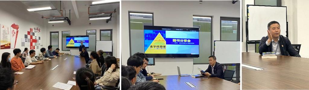 最后,现场的老师以及同学也都结合自身学习分享了自己的感悟。程利华、牛沭文及朱城运等人采用PPT讲述的方式向大家分享了《金字塔原理》这本书的读后感。内容包括什么是金字塔原理,为什么要用金字塔,如何构建金字塔以及金字塔原理的应用场景。