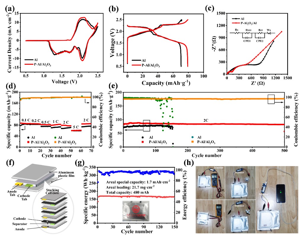 杜显锋教授团队利用激光刻蚀和阳极氧化技术制备了P-Al2O3/Al阳极,它不仅增加了电极的有效活性面积,而且形成了稳定的电极/电解质界面,使铝发生均匀地电沉积。这种阳极在5 mAh·cm-2的面容量下保持稳定循环1400小时以上。当高电流密度设置为10 mA·cm-2时,受保护的阳极在2900次循环中也显示出优异的电池稳定性。此外,使用P-Al2O3/Al阳极的480 mAh软包电池在0.5V至2.5V的电压下可以保持170 Wh·kg-1的能量密度和90%的能量效率(基于正极活性成分计算)。