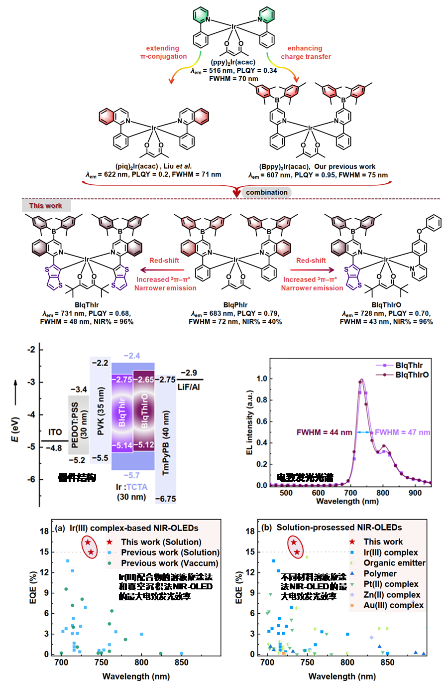 杨晓龙、孙源慧、周桂江等人与五邑大学陈钊合作报道了电致发光效率达到16.43%的纯近红外发光NIR-OLED。作者通过优化Ir(III)配合物的分子结构设计降低金属中心到配体电荷转移跃迁,提高三线态激发态中的基于配体的ππ跃迁成分,成功地将发光光谱半峰宽降低至43 nm,获得了最大发射峰位于730 nm附近的高效率纯近红外发光材料。作者采用溶液旋涂法制备了相应的电致发光器件,获得了与对应材料光致发光光谱近乎一致的纯近红外电致发光光谱,且最高电致发光效率分别高达15.00%和16.43%,显著超过了已报道的基于近红外Ir(III)配合物的NIR-OLED最高电致发光效率,也显著超过了采用溶液旋涂法制备的基于不同有机近红外发光材料的NIR-OLED最高电致发光效率。