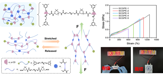 凝胶聚合物电解质(GPEs)兼具传统电解液和全固态聚合物电解质的优点,具有高离子电导率、灵活可调的电解质/电极界面、无液体泄漏风险等特点,在高比能和高安全固态锂金属电池(LMBs)研究中备受关注。然而,常规聚合物基体骨架由不可滑动共价键组成,当应对电池循环过程中枝晶生长和体积波动时无法保证电极/电解质界面的结构完整性,造成锂金属电池循环性能快速恶化。因此,亟需发展兼顾离子快速传导和坚韧机械性能的聚合物骨架,以保证电池整体性能的提升。