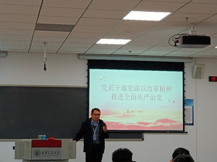首先,教师党员段新华同志进行发言,分享主题为党员干部党课以改革精神推进全面从严治党。