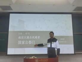 来自化学2301的刘一诺同学和来自化学本研2401的吴佳明同学为大家分享了关于国家公祭日的内容,主要围绕历史背景,设立历程,公祭活动,深远影响这四大部分进行讲解,通过PPT讲解与让全体成员观看南京大屠杀相关视频的方式让在场与会人员对南京大屠杀这一历史事件更深刻的感悟,理解了国家公祭日设立的重要性和必要性。