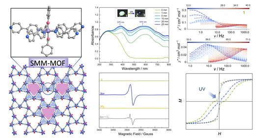 韩甜副教授(丁书江教授团队)联合南开大学程鹏教授,通过分子工程策略,采用光敏配体桥联与轴向强场配体协同调控,实现了高性能五角双锥构型Dy(III)单分子磁体在二维金属有机框架中的精准组装,并构建了Dy(III)离子易磁化轴的空间垂直有序阵列。该材料展现出卓越的磁学性能:磁翻转能垒超过1000 K,2 K时矫顽场达4500 Oe,创下了单分子磁体-金属有机框架体系的新记录。更为重要的是,该材料在室温条件下可通过紫外光诱导的电子转移过程产生稳定自由基,不仅表现出显著的光致变色现象,更实现了对磁弛豫动力学的有效调控,构建了光控磁双稳态开关系统。这项研究为开发具有分子级有序阵列的光响应磁性材料提供了新思路,对分子基光磁存储器件的创新发展具有重要意义。