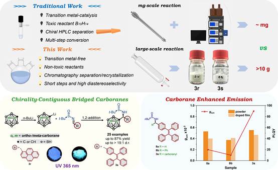 尽管近年来碳硼烷衍生物的发光特性已经得到了广泛研究,但碳硼烷基手性发光化合物的开发及其手性特性的探索与上述挑战是一致的,圆偏振发光手性小分子的探索仍然长期受制于复杂的合成路线及缺乏高效的大规模制备方法。具体而言,具有CPL活性的碳硼烷衍生物的常规合成策略主要依赖于①手性炔烃-癸硼烷的加成反应或②过渡金属催化的不对称B-H键活化反应。这些方法需要剧毒前体癸硼烷或昂贵的催化体系,通常也需要借助手性HPLC拆分实现对映体分离,导致成本高昂、研究样本单调以及制备规模不足,进而限制了对其光电特性的综合研究。因此,开发简洁且环保的不对称合成方法以实现对光学纯碳硼烷衍生物的可扩展和多样化制备对于其光电性质和构效关系的研究至关重要。