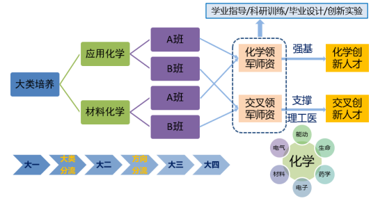 拥有化学、应用化学和材料化学三个专业,总人数301名,化学专业为2020年新增专业,另两个专业分别设置A、B班。A班依旧延续原有培养模式,教学、科研训练,毕业设计主要在化学学科完成。B班在夯实理科基础的前提下,结合国家重大需求,联合我校现有对化学基础要求较高的一流学科:能动、电气、材料、电子、生命、药学等,从理论教学、实践教学两方面实施学科交叉培养模式,通过开设选修课、科研训练、毕业设计等具体手段,充分利用学校的优质教育资源一方面提高学生培养质量,一方面提升科研工作的研究深度。A、B班的设置既为化学学科提供优质生源,也为工科、医学等专业方向培养基础扎实的创新人才(图一)。