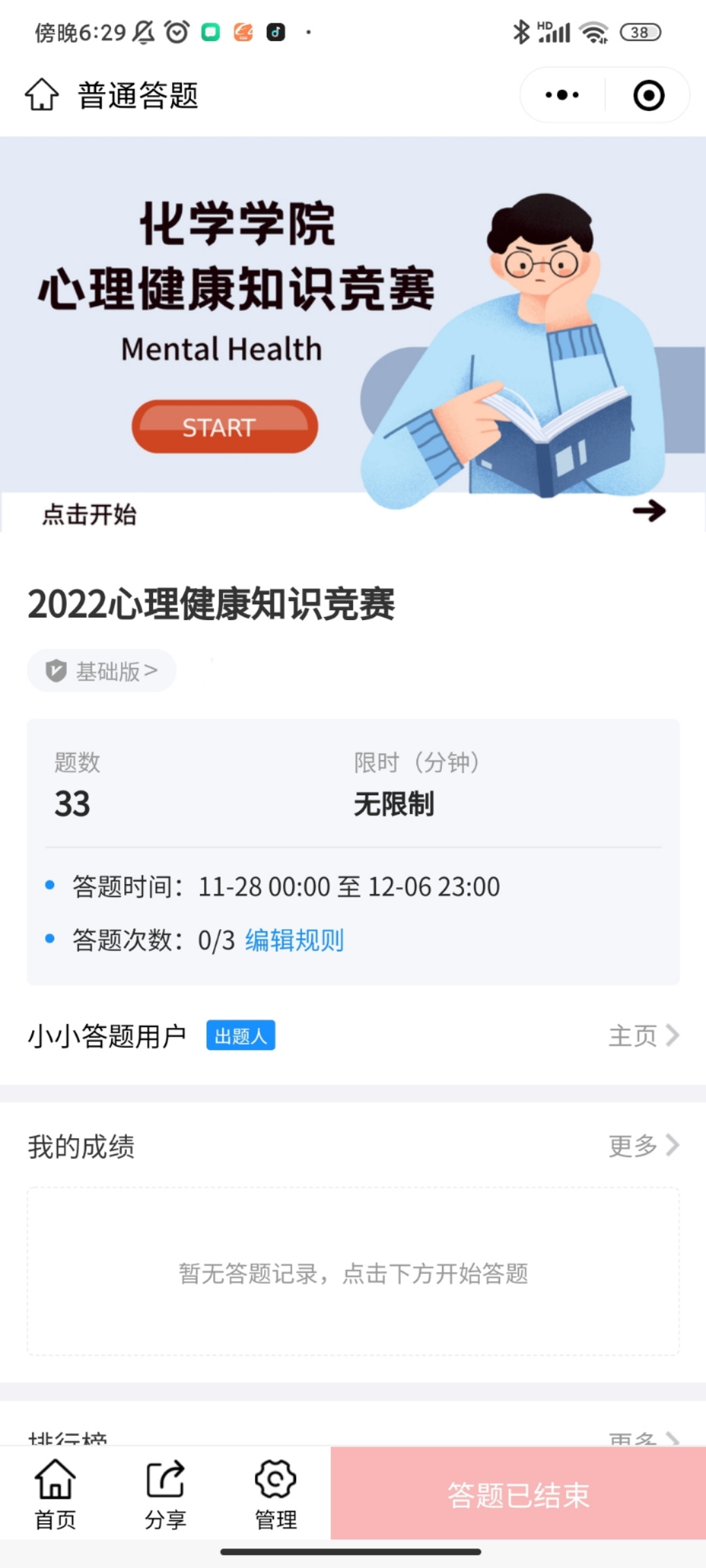 综上,本次心理健康活动月过程中,我院共开展了四方面的活动,包括:开展心理教育主题班会、开展心理健康学生干部主题沙龙、开展研究生心理健康讲座以及线上心理知识竞赛。这些多元化的活动有助于同学们以更好的生理和心理状态投入到后续的学习和科研工作中,有助于形成健康阳光、积极向上的科研学习氛围,有助于提升研究生的整体心理素质和整体素养。