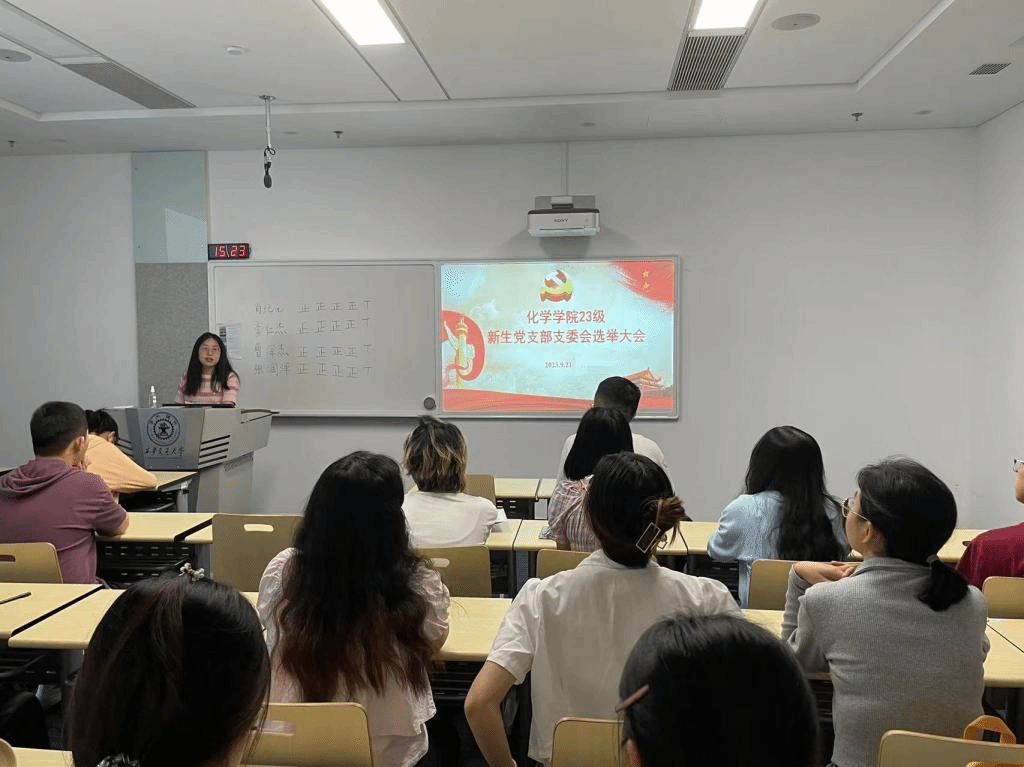 在激昂的国歌中,化学学院2023级新生党支部支委会选举大会拉开序幕。