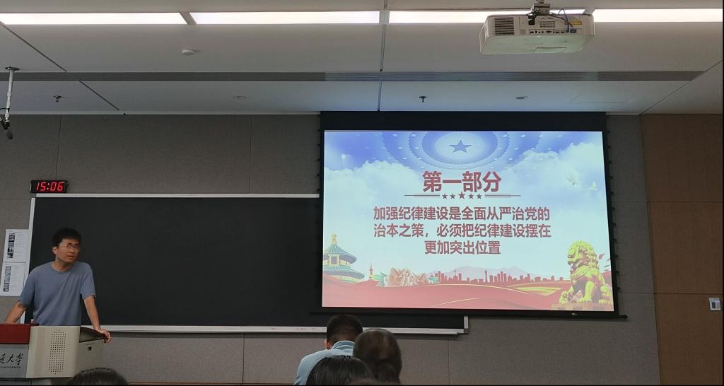 本次会议,以“党的纪律学习”为主题。会议伊始,支部书记成一龙老师强调纪律学习的重要性。成一龙老师结合自身工作实际,谈了对纪律建设的理解和感悟,并指出,面对新形势下的各种挑战,全体党员必须时刻保持警觉,自觉抵制不正之风,维护党的形象。每位党员需日常工作和学习中完善纪律践行情况,以确保纪律学习的常态化、制度化。